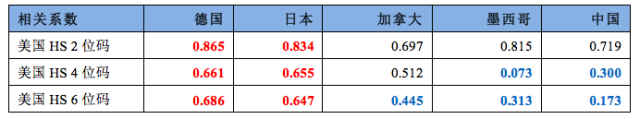 注:相关系数分别为美国出口HS 2位码、4位码和6位码产品与五国对应的出口HS 2位码、4位码和6位码产品金额的相关系数,表征了在该产品分类下的出口结构的相似性。