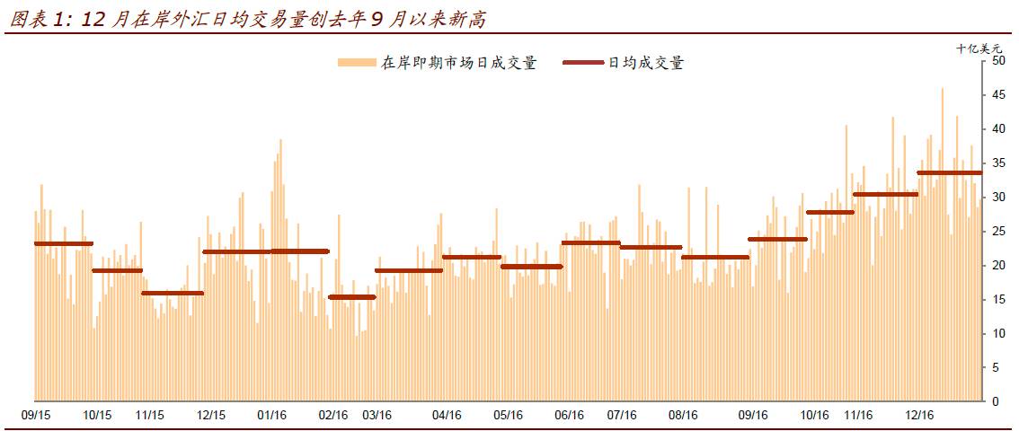 不过,中国早前(在对外并购、直接投资等方面)收紧资本管制的相关措施可能正发挥作用,抑制了外汇流出的速度。然而,12月在岸外汇日均交易量超过336亿美元,创下去年9月以来新高,不能说资本外流压力已经缓解。考虑到外储已处于3万亿美元整数关口边缘以及年初个人换汇额度更新带来的压力,在央行资产负债表和远期头寸等数据公布前,还不排除央行借入美元以暂时充实外储的可能性。