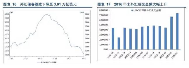 但是保外储的压力却大幅上升。外储的持续缩水,和人民币贬值背景下,央行稳定人民币汇率的操作有较大关联,年底以来,外汇市场交易量大幅提升,或说明央行加大对外汇市场的干预。尽管上周离岸人民币大幅升值,并进而引导在岸人民币升值。但是我们认为,本次离岸人民币的升值,只是在贬值趋势之中的阶段性反弹,并没有扭转市场对人民币的贬值预期,2017年伴随美联储加息逐步兑现和美国经济的持续回暖,或将对美元指数形成有力支撑,人民币承压。