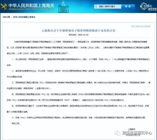 以下为《上海海关关于开展跨境电子商务网购保税进口业务的公告》原文: