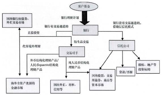 随着金融改革创新、资本市场发展的繁荣以及受利率的波动影响,理财资金投资方向不仅限于固定收益类工具而是更加的多元化。目前国内商业银行主要的理财资金投向主要包括直接投资、信托计划、QDII三种投资模式,从投资工具看,涵盖了利率、汇率、商品、股票、信用类产品及另类产品,具有多市场运作、多工具投资、多交易方式协同等区别于其他投资的特点。这种比例的变化和理财产品投资方向以及预期收益有一定关联。各种投资模式中预期收益由高到低分别为信托计划、QDII、直接投资。从标的资产上看,我国银行理财资金可广泛投资于货币市场、基金市场、债券市场、商品市场、外汇市场、黄金、石油衍生品以及非标准债权资产等。