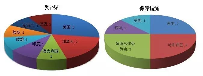 从发起国家或地区来看,52起案件由21个国家或地区发起,以发展中经济体国家(地区)为主,其中35起贸易摩擦案件由16个发展中经济体国家(地区)发起,其余17起案件由5个发达经济体(美国、欧盟、加拿大、新西兰和澳大利亚)发起。而且发展中和发达经济体发起贸易救济措施的类型明显不同,发达经济体更偏向采用反补贴措施,11起中有8起均由发达经济体国家发起调查,美国和加拿大分别发起3起和2起反补贴案件,澳大利亚、欧盟和新西兰各1起;而发展中经济体更偏向反倾销和保障措施,8起保障措施案件均由发展中经济发起,34起反倾销案件中仅10起由发达经济体国家发起。