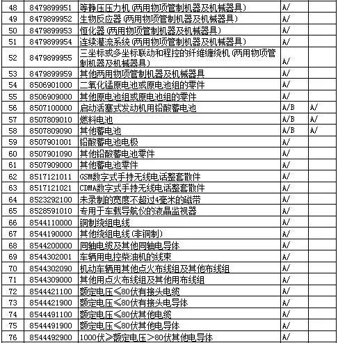 一、取消12个10位海关商品编码的监管条件“A/B”,检验检疫机构不再实施进/出境检验检疫;将17个10位海关商品编码监管条件由“A/B”调整为“A/”,检验检疫机构实施进境检验检疫;取消168个10位海关商品编码监管条件“A/”,检验检疫机构不再实施进境检验检疫。