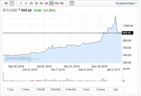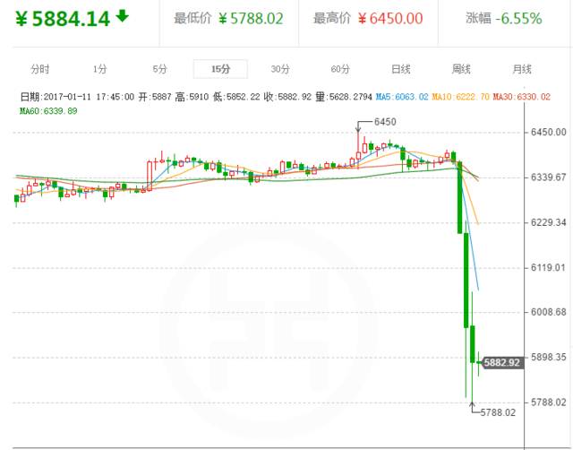 在1月5日盘中,比特币报价最高1250美元/8895元人民币,但下午大量抛盘导致比特币出现闪崩,最低至865美元/6000元人民币,跌幅高达32%。