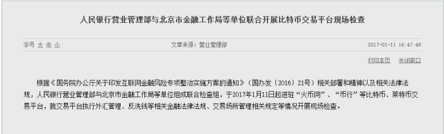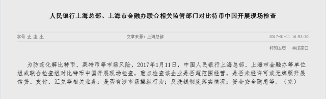 据央行上海总部和央行北京营业管理部发布的公告称,1月11日,央行检查组先后进驻“比特币中国”、“火币网”、“币行”等比特币、莱特币交易平台,就交易平台执行外汇管理、反洗钱等相关金融法律法规、交易场所管理相关规定等情况开展现场检查。