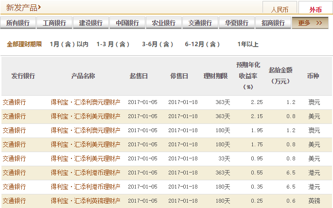 国有银行和外资银行都可以买到外币理财产品。根据普益标准的监测数据,2016年第四季度国有银行共发行了220款外币理财产品,其中138款美元产品,39款澳元产品,29款英镑产品,14款港币产品;股份制银行共发行了181款外币理财产品,其中156款美元产品,13款澳元产品,12款港币产品;城市商业银行共发行了48款外币理财产品,均为美元产品;外资银行发行了37款外币理财产品,其中36款美元产品,1款澳元产品。