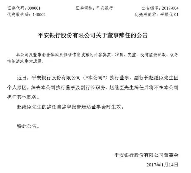 平安银行发布公告称,近日公司执行董事、副行长赵继臣因个人原因,辞去本公司执行董事及副行长职务。值得玩味的是,赵继臣是在平安银行董监高