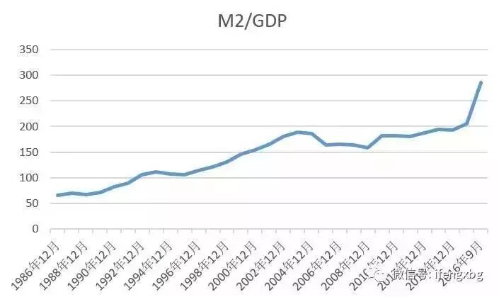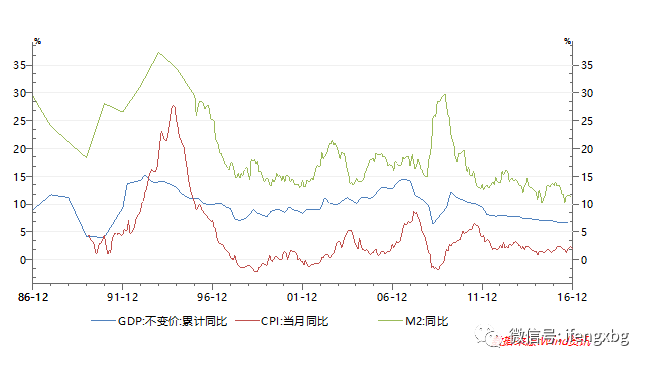 近年最后一次货币超发高峰在2009年,即大家熟知“四万亿计划”,M2最高速度达到了29.74%。虽然此后,M2发行速度有所减慢,但由于大额总量的支撑,导致M2总量快速上升,规模超过155亿。而与此对比的是,GDP同比增速在10年小幅回升之后,一直开始缓慢减少,一直到2016年前三季度维持在6.7%的增速。