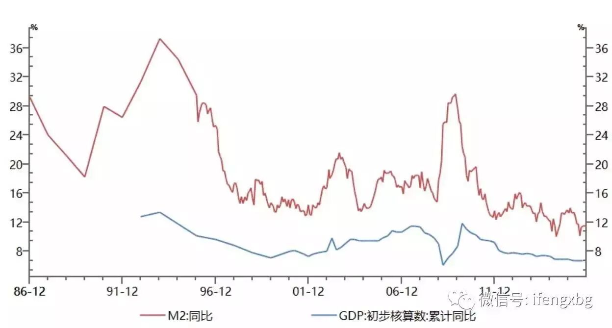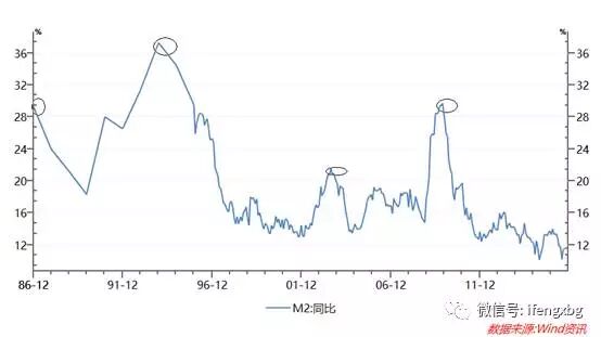 1986年,广义货币增速最高达29.30%,这一年GDP增速8.9%,货币增速是GDP增速的3倍。往前一年,85年GDP增速13.40%,往后87年、88年、89年、90年分别为11.7%、11.2%、4.2%、3.9%。应该说GDP增速在温和反弹后急剧下降。