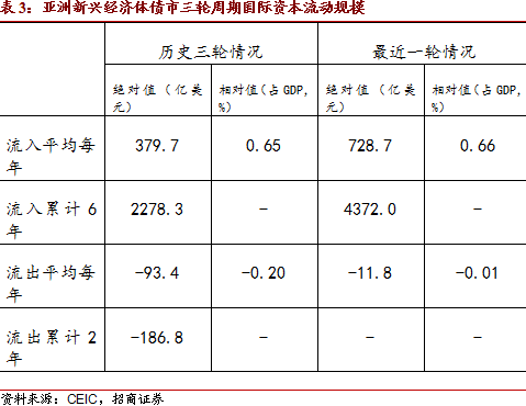 笔者重点参考2000年代以来,亚洲新兴经济体债券市场国际资本流动三轮周期波动中,债券市场国际资本流动与GDP平均比值的波动情况进行估算。如果假定2016年开始新一轮资本流入周期,国际资本流入6年,流出2年,则未来的5年间中国债券市场将吸引4000至4400亿美元的国际资本流入。2016年9月末,境外投资者在我国债券市场中的占比仅为1.3%,在国债市场中占比也仅为3.7%,远低于新兴经济体债券市场中外国机构平均10%的占比和国债市场中平均20%的外国机构占比。即使考虑未来的国际资本流入,到2020年,境外机构在中国债券市场中的占比仍不到4%,在国债市场中的占比可能仍不到8%,这个估算规模并不激进,且与6000至22100亿美元的理论估算年均资本外流值相比有如杯水车薪。
