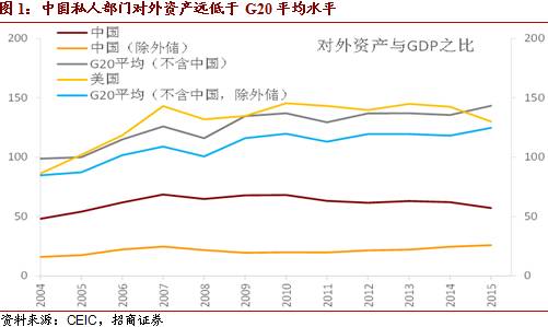 为何说中国居民部门增加对外投资是大势所趋呢?一言以蔽之,中国居民部门的对外资产不是太多而是太少啦。截止2015年末,中国私人部门持有的对外资产与GDP的比为25.9%,较之G20国家平均的124.7%低99个百分点,仅仅相当于G20国家80年代初,即35年前的水平。即使考虑国际储备资产,中国私人和官方的对外资产总额与GDP之比为57.2%,也仅相当于G20国家20年前,即1996年的水平。鉴于中国仍可能在未来相当长一段时期内保持经常项目顺差,这就意味着中国作为一个整体仍将不断增加持有对外资产。2014年之前,对外资产主要由中央银行以外汇储备的方式持有,其优点是安全性和流动性高,缺点是收益率低。从目前的趋势看,对外投资将转由个人和企业等私人部门完成,其投资的安全性和流动性可能会下降,但收益率可能上升,比如曹德旺先生在美国的投资。