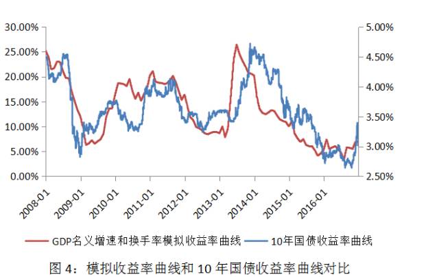从模拟曲线与10年国债收益率曲线对比中可以看出,模拟曲线走势与实际10年国债收益率曲线走势相吻合,上述基于GDP名义增速和交易换手率的量化模型能够有效观测利率曲线走势,并可得出如下结论: