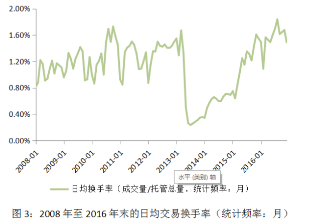 本文将交易换手率定义为现券成交量与债券托管总量的比例。鉴于我国地方政府债推出时间短、体量相对较大,绝大多数债券用途为置换地方政府债务,二级市场几乎无流通,债券融资特性远远大于交易特性,本文在计算交易换手率时剔除地方政府债。如图3所示为2008年至2016年12月按月统计的日均交易换手率变化曲线。