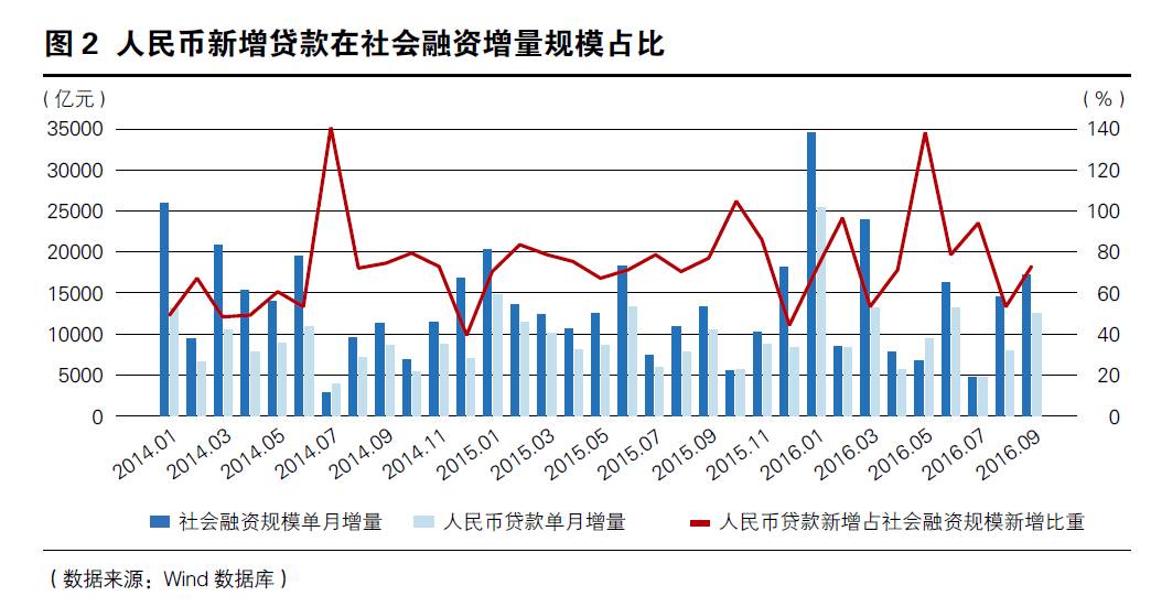 由重资产型银行向重交易型银行转变。2016年9月,在当月社会融资增量规模中,人民币贷款比重仍高达73.78%,详见图2所示。从国际比较来看,我国近10年来中长期贷款比重约为60%,高于中上等收入国家56.8%的平均水平(World bank 2015),这从一定意义上反映出银行贷款承担了更多的周期性风险。商业银行作为信息中介和风险经营机构,如果要减轻过多周期性风险的影响,本质上看其发展战略要由过去的重资产经营逐渐向轻资产经营转型,减少对存贷款的过度依赖。这就意味着要利用多层次的金融市场融资机会,大力发展商业银行资管业务和投行业务,从信贷经营逐步变成信用管理。同时通过提供诸如财富管理、私人银行等更多样的金融服务,延伸更广泛的业务线。发展多种盈利方式,改变过去以息差收入为主的状况,构建息差和非利息收入并举的稳定收入结构。