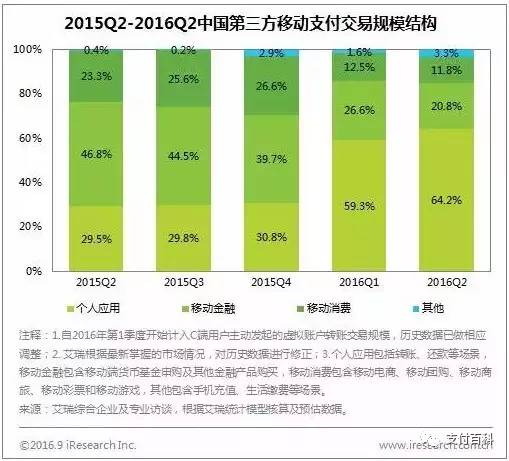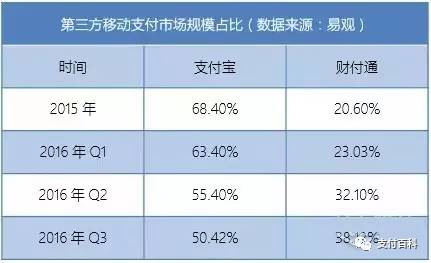 很明显,支付宝与财付通两家已基本垄断了国内第三方移动支付市场。另外一点是,这俩家似乎正处于此消彼长的状态——从2015年到2016年的第三季度,支付宝的市场份额损失了近18%,而财付通增加的份额几乎与此一致。