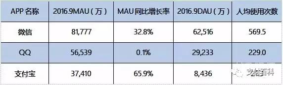 这里有一份数据,第三方数据平台QuestMobile 9月公布的报告显示,在 Android、iOS 两端,微信、QQ的月活位居前两位,支付宝则名列第6。