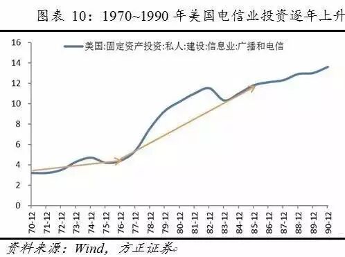 以电信行业为例,在1977年之前,其私人建设投资仅仅维持了年化个位数增长,而到了1977年之后,私人建设投资则显著加快,在之后的几年里年化增长率加快到了接近11%的水平。