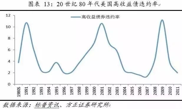 高收益债在70-80年代的盛行也催生了资产泡沫。80年代末,关于高收益债的负面新闻开始鹊起,高收益债市场受到情绪、监管、信贷紧缩等一系列因素影响,其市场承受了巨大的抛压,债券违约率迅速攀升。整个80年代,高收益债的平均违约率仅仅不到4%,到了1991年,高收益债的违约率蹿升至11%左右的空前高位。