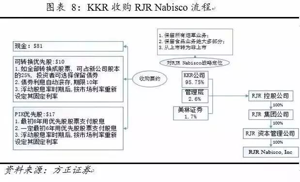 收购的另一方是著名并购公司KKR。KKR时为杠杆并购业界翘楚,业务量占当时市场总交易量的四分之一,尤其擅长利用垃圾债完成高杠杆收购。KKR之所以对RJRNabisco感兴趣,是因为其同样认同RJRNabisco的成长价值,并且认为管理层75美元/股的出价太低。