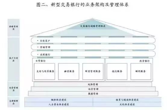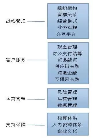 一是以互联网“平台”思维构建交易银行组织结构体系,包括资产托管、支付结算、现金管理、贸易融资等平台。
