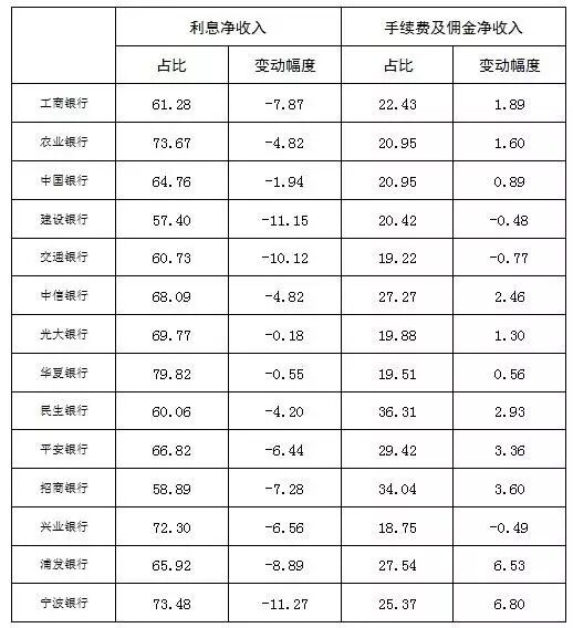 表1 国内14家上市银行2016年一季度营业收入构成变化(单位:%)
