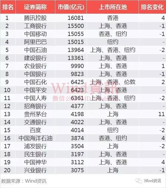 腾讯控股超过工商银行夺得第一。除了前3名上市公司,还有3家公司市值超万亿元,分别为阿里巴巴、中国石油、建设银行。