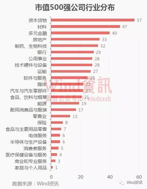 从500强公司行业分布来看,资本货物行业企业数量最多,达到57家,其次是材料和多元金融行业。