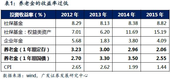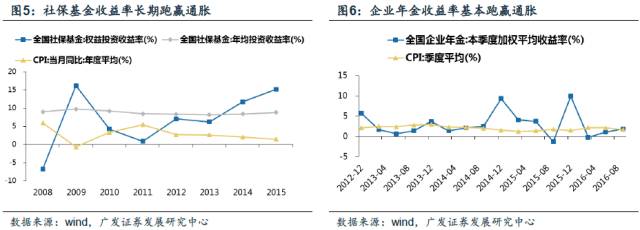但社保基金和企业年金的收益明显跑赢通胀。全国社保基金的年均投资收益率长期在8%以上,其中,权益类资产的收益率的长期均值也在6.81%(如果剔除08年股灾的影响,09年-15年的长期均为 8.75%),全国社保基金的投资收益远高于CPI;2012年-2016年三季报,企业年金的平均收益水平为2.94%,略高于同时期CPI均值的2.01%。