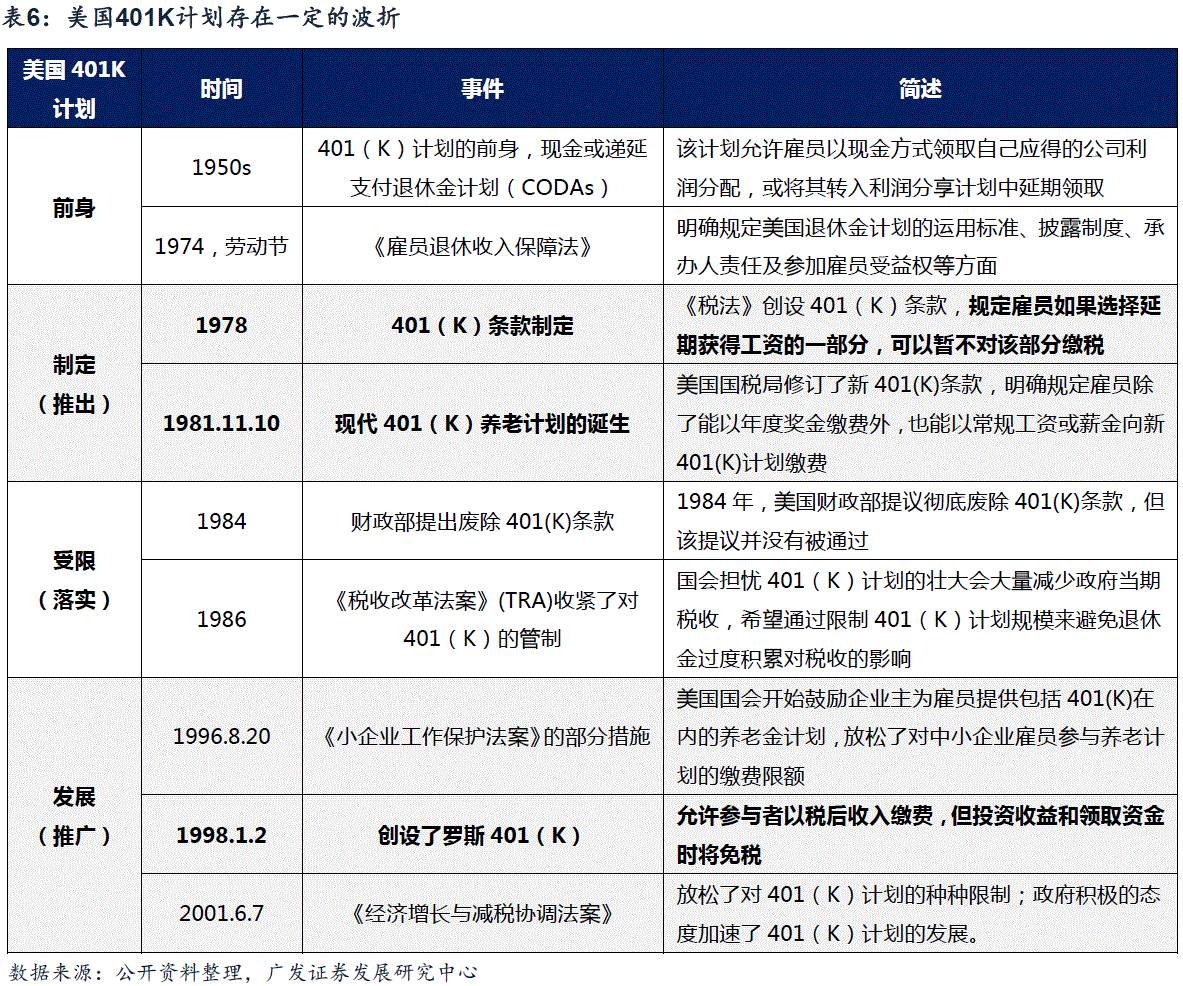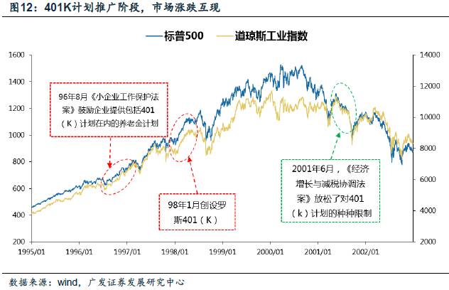 推广阶段:在401K计划的推广阶段(1990年代),主要有三个关键时间点:1996年8月推出《小企业工作保护法案》、1998年1月创设罗斯401(K)计划、2001年推出《经济增长与减税协调法案》加速401K计划的发展。可以看到,除了2001年股灾阶段市场持续下跌外,其他阶段美国股市均明显上涨。