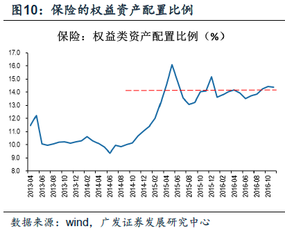 养老金的权益资产配置比例可以参考社保基金和保险的数据,但养老金对保值的要求更高,风险偏好相对更低。根据测算,最近两年社保基金的权益资产配置比例在12%-13%之间;;同时,险资的权益资产配置比例从16年开始在14%左右震荡。由于养老金的风险偏好更低,权益资产配置比例将略小于社保和保险,我们暂估为12%。