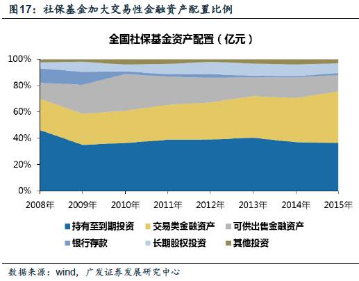资产配置:加大交易性金融资产配置比例,风险偏好小幅提升。在社保基金的资产配置中,可以明显看出,从2013年以来,交易性金融资产占比明显提升,而持有至到期投资的占比明显下降。交易性金融资产的价格变化即时反映到损益表,而持有至到期投资对应资产的价格变化,在短期内不影响财务报表。