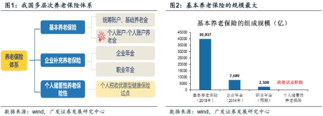 企业补充养老保险,起步较晚,规模相对较小,主要包括企业年金和职业年金,其中,企业年金在2014年达到7689亿元,而职业年金从2014年开始设立,完成全面筹资还需2-3年,预计资金规模为2500亿,企业年金和职业年金合计在1万亿左右,仅为基本养老保险规模的四分之一;个人储蓄性养老保险,目前还处于试点阶段。