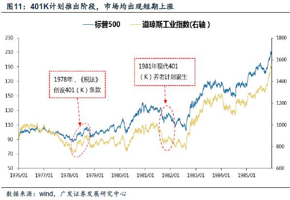 推出阶段:在401K计划的推出阶段(1970年代末-1980年代初),主要有两个关键时间点:1978年税法创设401K条款、1981年美国国税局通过401K计划。可以看到,1978年全年标普500和道琼斯工业指数均明显上升;1981年11月开始标普500和道琼斯工业指数都出现了一波明显的反弹。