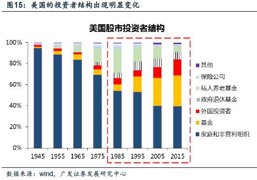 随着以401K计划为代表的美国养老金等长期资金持续流入股市,美国资本市场的投资者结构发生了深刻的变化。通过测算401K计划投资股市的规模以及占美股市值比,可以看到,从1990年代以来,401K计划持股市值占比持续提升;同一时期,美国的养老金资产规模也大幅提升,这部分长期资金不断流入股市,使得美国股市的投资者结构出现了明显的变化:个人投资者占比持续降低,以共同基金为主的机构投资者规模大幅提升。