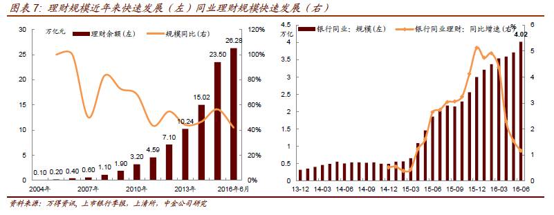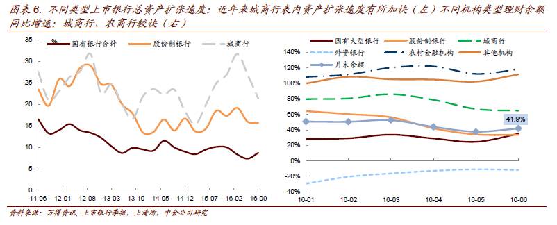 当然目前还不清楚会否做此调整,或者会否新老划断或者给予足够的缓冲期,其对债市的潜在冲击值得密切关注;尽管实际操作中,同业负债科目在做表时存在一定的调整空间,但目前诸多中小行和部分股份制行占比超标,还是会限制一些中小银行同业扩张的规模,尤其是对负债来源有限的中小银行扩张业务不利。回首看,城商行与股份制银行表内、表外业务扩张速度均较快(如图6)。如果政策倒逼同业这块业务缩表,在整体缩表过程中,债市需求会明显收缩,尤其是同业理财由于可赎回,将首当其冲,处境堪比流动性冲击中的公募债基。如果推演同业存单——同业理财——委外这一链条,由于广义基金后面主要对应的是信用债、政金债,或者二者与国债的利差也会小幅的影响。而资金回流大行、股份制行后,这些机构对债券的配置力度难以和上述链条主体等量齐观,且口味更为清淡,以利率债、高等级信用债等为主。