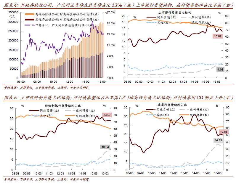 从三季度上市银行资产负债数据来看,同业存单一般计入上市银行应付债券科目,因此13年后中小银行应付债券科目快速增长。而由于从本质上,同业存单与同业存款存在一定的相似性,如果在会计处理上将同业存单从纳入“应付债券”科目转向纳入“同业负债”科目,尽管全部商业银行的广义同业负债在总负债占比并不高,从其他存款性公司的资产负债表来看,“对其他存款性公司负债”、“对其他金融性公司负债”在总负债占比目前在13%左右;但对于同业存单发行较多的中小型银行的“同业负债”科目在负债总额的占比会超过33%。从占比角度来看(如下图):