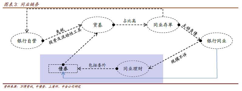同业存单的便利性显而易见,流动性好、收益性,因而深受投资者喜爱;计入应付债券,无需缴准,相比同业存款不存在提前支取,深受融资银行喜爱;因此同业存单成为中小及部分股份制行的资产负债表扩张利器(相当于从大行借入准备金)。而除用于资金周转外,也衍生出一些套利模式(如图3)。比如套作同业理财、委外和债券,同业存单到同业理财到债券,一般情况下,每个环节都存在正利差,因而银行有动机发行同业存单去购买同业理财、同业理财冲了规模之后也会形成债券配置需求,这也是过去同业理财快速发展的原因之一。而在此过程中,准备金再次转移(交易对手是银行),要么派生存款缴准(一级申购信用债,对整个银行体系),要么变成财政存款(一级认购国债)。完成这一步,A银行的负债端是应付债券,资产端开始对应同业理财等各类资产,赚取其间息差。显然,对债市影响较大的不是其中银、银之间的资金周转,或是对广义货币的影响,而是同业存单的资金运用方式。