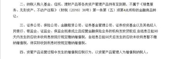 “2、纳税人购入基金、信托、理财产品等各类资产管理产品持有至到期,不属于《销售服务、无形资产、不动产注释》(财税〔2016〕36号)第一条第(五)项第4点所称的金融商品转让。”