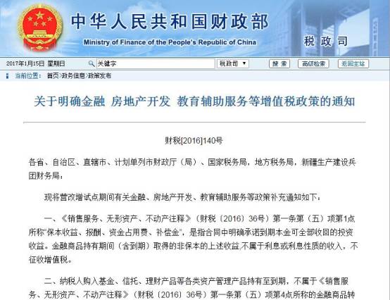 对于1月11日下发的140号文补充意见,这份通知表示,资管产品运行过程中要交的增值税本来是要追溯至2016年5月1日的,现在不仅不追溯了,还延缓至2017年7月1日,业内人士称,这不仅解决了已经到期结束或者合同已经签署产品可能发生的纠纷问题,还给了资管公司缓冲的时间,下一步如何和客户沟通“预期收益”的问题!同时,更重要的是,资管公司还期待,140文的配套细则能够进一步明确,包括可能涉及的金融产品嵌套如何纳税、资管公司估值方法是否需要改善等等。