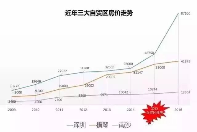 25公里海岸线,面向世界的经济要地 从地理位置上看,前海与香港比邻,横琴毗邻澳门与香港,两者都是粤港合作的平台,难免形成竞争关系。 而南沙,位于珠三角的几何中心,可谓是左右逢源,方圆100公里有深圳、东莞、珠海、中山、佛山、江门等14个大中城市,它的定位是“面向世界”。 更为重要的是,南沙是广州仅有的临海区域,有25公里长的海岸线,是珠江口上的天然良港,其所依托的经济要地远远大于横琴和前海。 CEPA先行先试综合示范区, 持续发展性高 前海在与香港合作及金融创新方面比较突出,橫琴在拓展与澳门的合作方面比较突出。再看南沙,南沙在广州,而广州是广东省的省会,未来将有很多政策上的优势和扶持,此外南沙也是广东省唯一“实施CEPA先行先试综合示范区”。 借助CEPA机遇,南沙可以发展成为粤港澳三地紧密合作的主体区域,并与珠海的横琴、深圳的前海共同形成“一体两翼”的粤港澳区域合作新格局。 一桥之隔差6倍房价,增值潜力无限 深圳前海自贸区房价均价90000元/m²,珠海横琴自贸区均价40000元/m²。而三大贸易区之首的广东南沙,均价仅14000元/m²。仅一桥之隔均价相差3-6倍,是少有的价格洼地。 2016年第一季度南沙楼市成交同比再上涨28.3%,房价连涨3个月。南沙房价与前海和横琴对比,具有更大的投资空间,增值潜力无限。南沙作为面向世界的窗口,随着未来配套不断丰富,住宅地块增值潜力不可同日而语。
