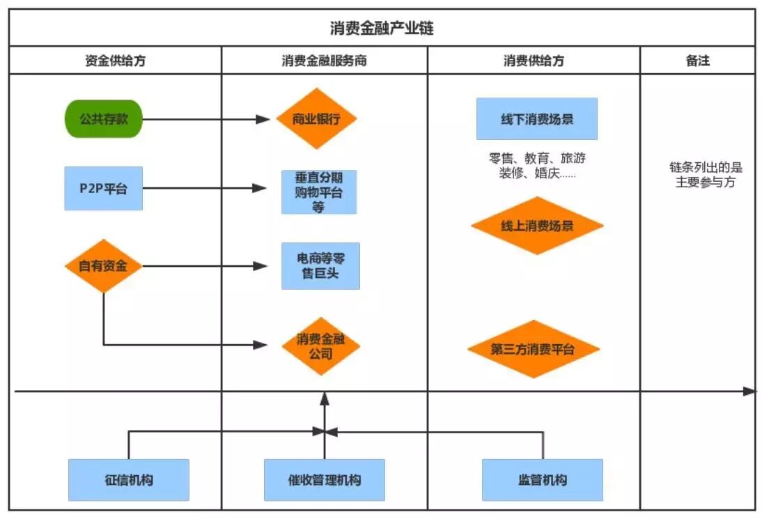 目前,消费金融的参与主体众多,下图展现了 P2P 平台在消费金融产业链中的角色分工。