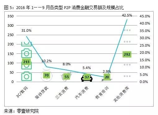 零壹研究院的数据显示,2016年1——9月,P2P 消费金融规模共计687亿元,按消费场景划分,各类消费金融 P2P 交易数据如下图所示。3C/数码贷款是唯一规模过百亿的类别,达到213亿元,占到整体的31.0%;装修贷款、三农消费分别为70亿元和55亿元;汽车消费和教育培训分别有37亿元和20亿元;其他消费类(生活旅游、医美分期和现金贷等)约292亿元,占到 P2P 消费金融整体的42.5%。