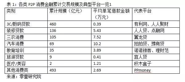 分类来看,3C/数码类的 P2P 消费金融历年累计规模约460亿元,其中约300亿元来自分期购物平台,其余则由各 P2P 平台资产团队开发,有利网和拍拍贷3C/数码类消费资产累计分别有55.7亿和18.0亿元。住房装修类贷款累计约136亿元,以人人贷和点融网为代表,累计分别达到43亿元和15亿元。三农消费 P2P 平台主要为农民的生产消费提供小额融资服务,累计规模约105亿元。汽车消费资产主要为个人分期购车,规模靠前的包括豫商贷和钱庄网。教育培训类累计规模约35亿元。其他如下表所示。