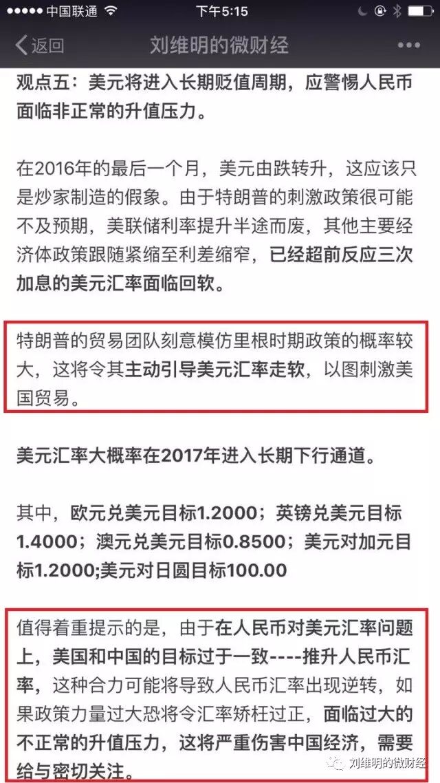 中国一直在避免打贸易战,也就是这个时候人民币汇率的升值,在某种意义上向特朗普示好,表达友好的信号。特朗普也在最近有所态度软化,表示不会上台第一天就宣布中国为汇率操纵国,但是要坐下来谈。