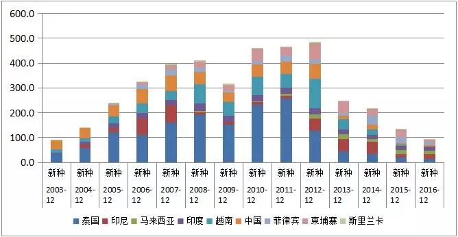 2012年以来,主要生产国天胶产量上升并稳定在高位的主要原因是,由于之前橡胶一直在高位大幅振荡,许多产胶国纷纷增加橡胶种植面积,2006 —2008年种植面积的增速较2001—2005年大幅提高。2010-2012年,许多产胶国增加的橡胶种植面积,增速大幅提高。2012年,新增天胶种植面积为483.6千公顷,达到历史高峰。