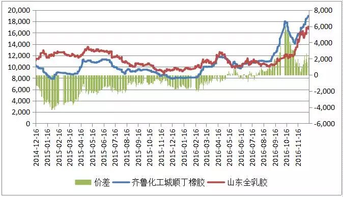 2014年底以来,顺丁橡胶长期低于天胶价格。但2016年8月后,受益于过剩产能减产,部分装置关闭,关闭装置利好,顺丁橡胶与天胶价差由负转正。2016年10月18日,价差为5800元/吨,2016年12月中旬,下降为2000元/吨,对天胶价格带动作用减弱。从长期起来看,受原油不振的影响,合成胶价格对天胶的带动作用将有所弱化。