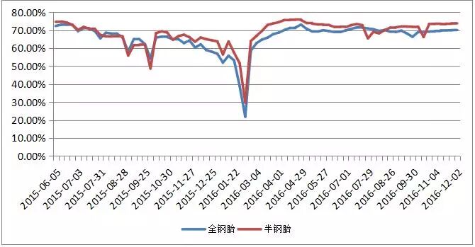 2016年轮胎市场全年生产较为均衡,大多数月份产量保持在8000万条以上。2016年轮胎产量能够站稳,主要得益于第四季度生产不像去年出现回落,而是出现反季节性现象。从季节性来看,轮胎开工率高峰期一般在4、5 月份,后期开始逐步走弱,在9、10月反弹后再次走软。 但今年高峰期过后,轮胎开工率走软幅度极为平缓。开工率9、10月反弹幅度较大。 11月18日,国内全钢胎、半钢胎开工率分别为69.98%、73.63%,比10月中旬反弹高峰还高,出现反季节性变化。下游轮胎开工率维持较高水平,主要是由于国内汽车销售较好。