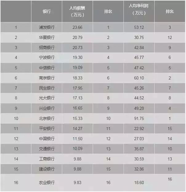 16家银行工资排行表