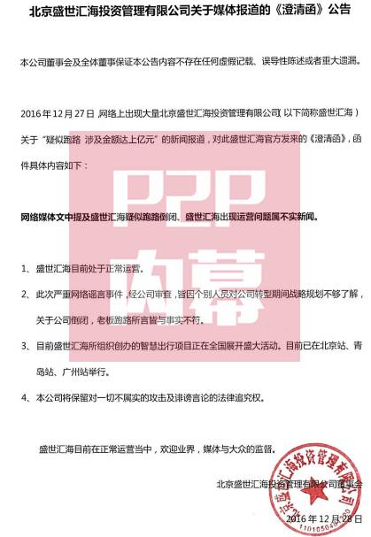 对此,北京盛世汇海投资管理公司于2016年12月28日通过官网发布《关于媒体报道的<澄清函>公告》。公告表示,目前网络媒体所提及的有关盛世汇海公司疑似跑路倒闭、资金断裂、出现运营问题的报道属于不是新闻,目前公司运营一切正常,且各项投资项目都在有序进行当中。