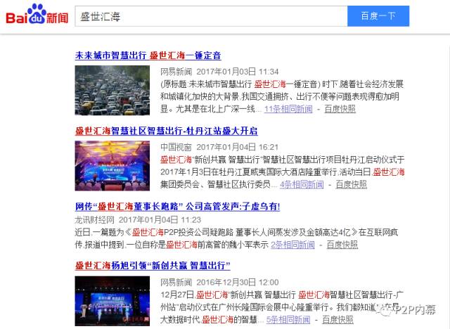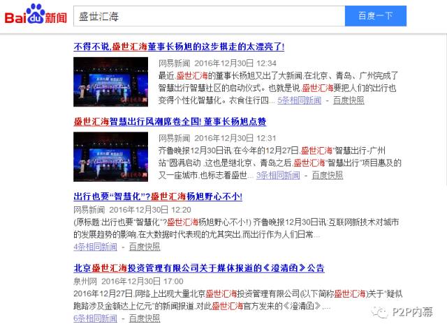 盛世汇海还花了不少钱在媒体的广告投放上,当时新闻的首页关键词“盛世汇海”几乎都是正面报道,没有一篇写到其全国范围的大面积逾期。